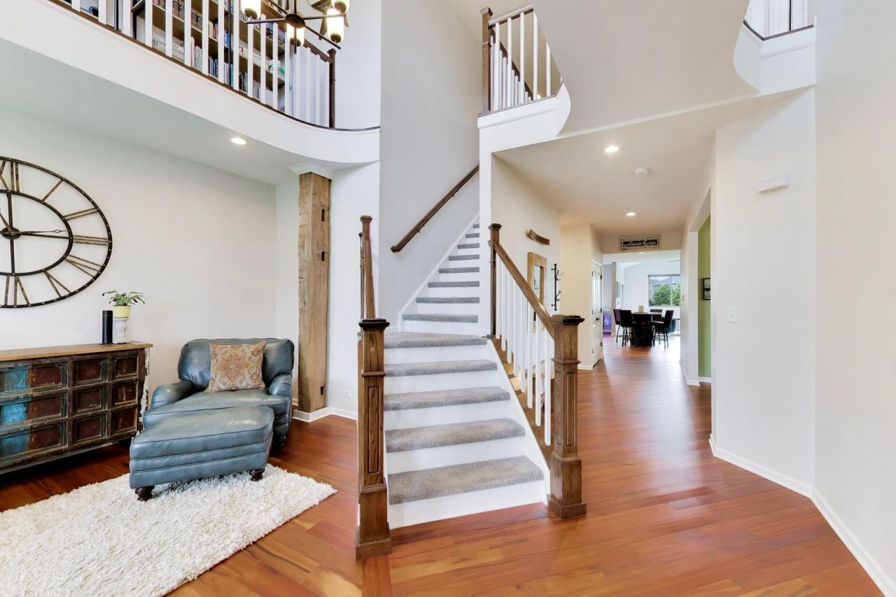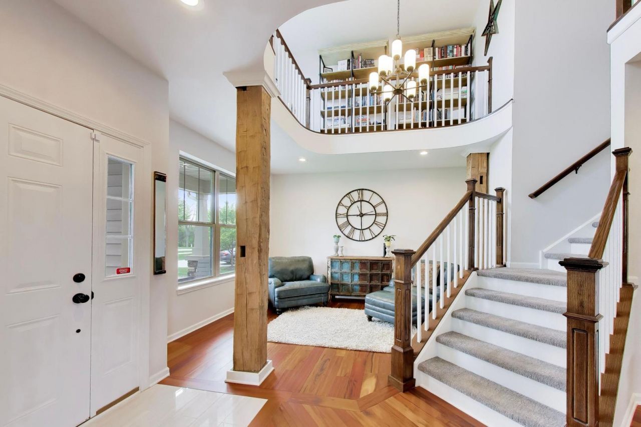 IMPRESSIVE does not even begin to describe this amazing home with UNIQUE AND CUSTOM features throughout. Gorgeous Brazilian hardwood floors on main level. 2 story entry with TAILORED MADE 2nd floor WRAP AROUND LIBRARY. Sunny living room area includes wood beam barn posts. Flex room (could be used as den, playroom or cafe room) features built in wet bar with beverage fridge, glass pocket doors leading to foyer and French doors opening to formal dining room. Gourmet kitchen has 42 cabinets, under cabinet lighting, breakfast bar, tons of counterspace and opens to 15' x 12 hearth room with corner fireplace and spacious family room with shiplap wall. You'll find a ONE-OF-A-KIND office nook off the family room - perfect for home office or homework area. OUTSTANDING and beautifully finished basement features rec room area, theater area, built in tavern style table, bar room with BARREL CEILING, exercise room, TORNADO/SAFE ROOM and half bath. Oversized primary bedroom boasts COZY READING NOOK, his/her walk-in closets (each with closet organizers) and private bath with dual vanity, soaking tub and glass shower. Bedroom 2 includes ensuite bath. Bedrooms 3 (has large walk-in closet with organizer) and 4 have jack and jill bath. Gorgeous backyard with large wrap around deck for outside gatherings. Other outstanding features include 2nd floor laundry room with cabinetry ~ Mud room with built in bench, cabinets and 2 closets ~ Updated powder room ~ Upgraded banisters ~ Lighted basement stairs ~ Alarm system ~ Electric charging station in 3 CAR TANDEM GARAGE ~ Dual zone HVAC and more. This home is a true ENTERTAINER'S DREAM.